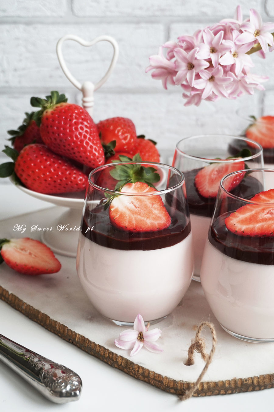 Przygotować polewę. W misce ułożonej na garnku z gotującą się wodą roztopić połamaną czekoladę, wlać śmietankę i wymieszać. Polewa powinna być błyszcząca i gładka. Lekko ją przestudzić i przelać na schłodzone deserki. Wyrównać i odstawić w chłodne miejsce do zastygnięcia czekolady. Ozdobić truskawkami lub innymi owcami przed podaniem.
